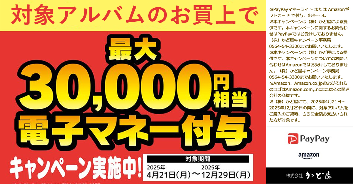 - 対象アルバムのお買い上げで最大30,000円相当の電子マネー付与キャンペーン実施中!